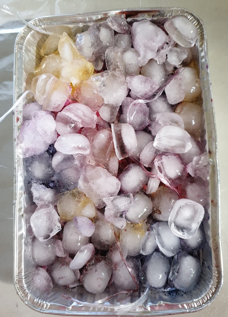 The only experience I had of dyeing clothes before this all started was many moons ago at school. We had a t-shirt or piece of fabric, tied rubber bands around different areas and dunked it into a bucket of dye – one colour, that was it. I didn’t even know how to create the multi-colour t-shirt in my first blog post before looking it up online (thank you You-Tube). It wasn’t until I joined online dyeing groups that I came across the wonderful world of ice-dyeing and that was a game changer for me.