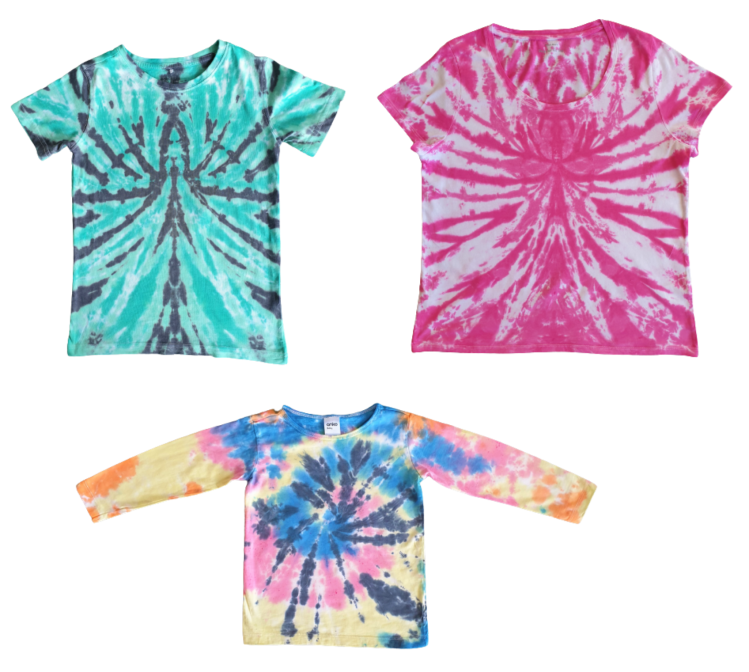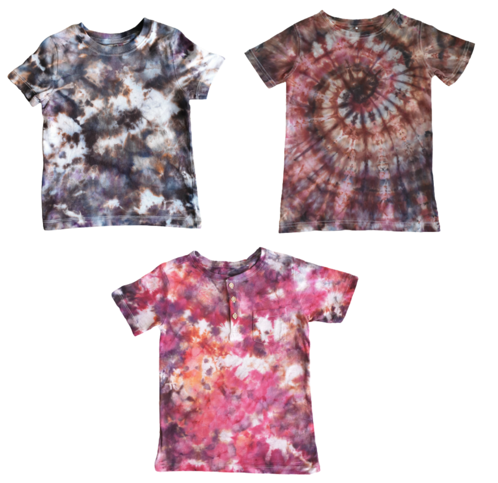 With ice dyeing, the individual colour splits, unless it’s a primary colour like turquoise, fuschia or yellow. So that tangerine colour you’ve bought, could split into the variety of colours that went together to create the dye powder. The shirt on the top left was just one dye colour – black. It can be quite exciting waiting for the results to see what you get.