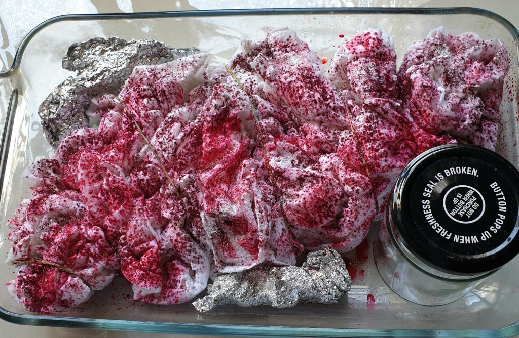 You need to ensure the item is made from natural fibres – this was 100% cotton. As the top was clean and in excellent condition, it was just a matter of soaking it in soda ash, drying and then deciding how I was going tie it and choosing some colours. I decided on doing something very simple – just scrunching it up in a container, sprinkling the dye, placing a layer of ice on top and just waiting for the magic to happen. I used some of my colour swatches to choose a colour I liked and ended up choosing Rose Red.