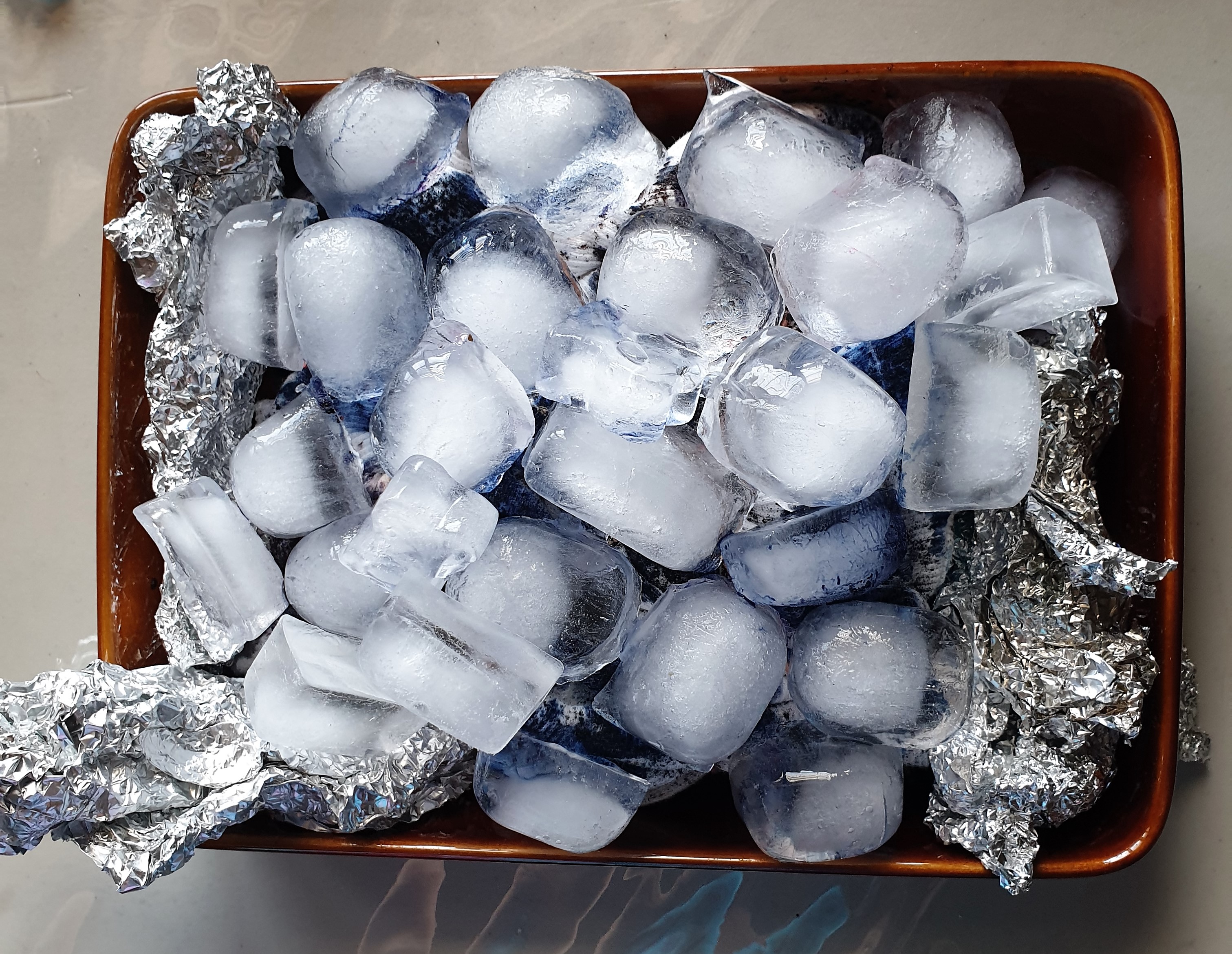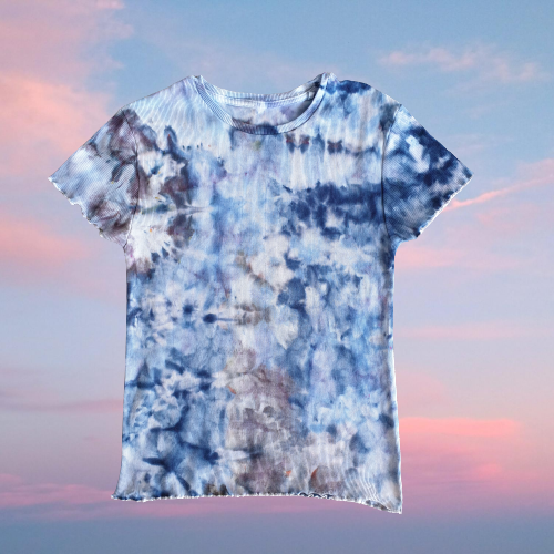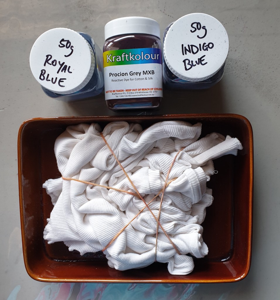 Before dyeing, I washed the top, dried it, soaked it in soda ash and left it to dry again. I did a simple scrunch with this top and did a “muck” ice dye i.e. it wasn’t on a rack – it was left in the container as shown. The colours I used were Royal Blue and Indigo Blue from Sunny Daisy Tie Dye and Grey MXB from Kraftcolour.