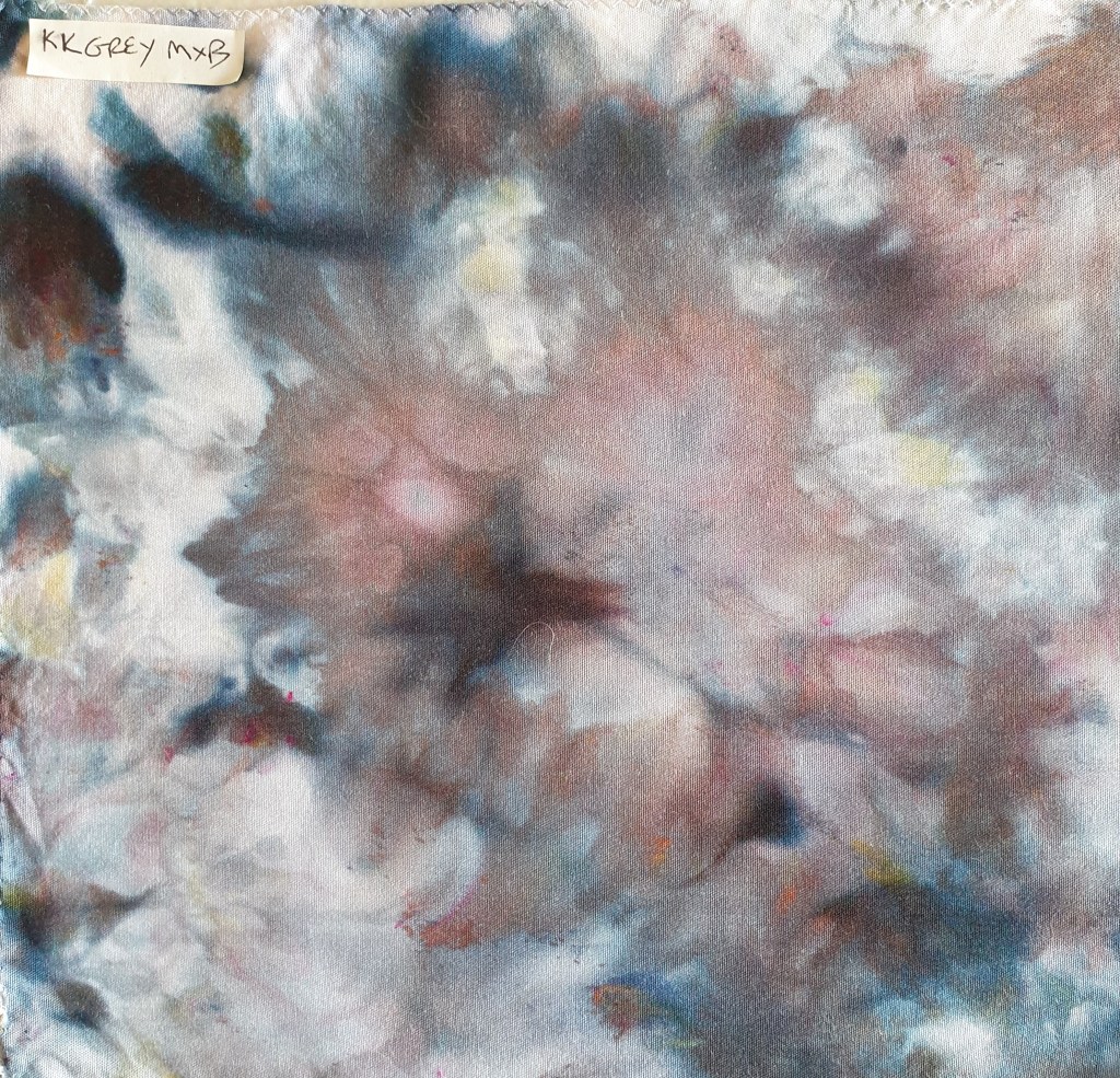 Instead of doing something with bright colours, this time I decided to go with blues and greys. Why grey? Because when ice-dyeing, some greys split into different shades of dark blue & a bit of brown. The swatch below is Grey MXB from Kraftkolour.
