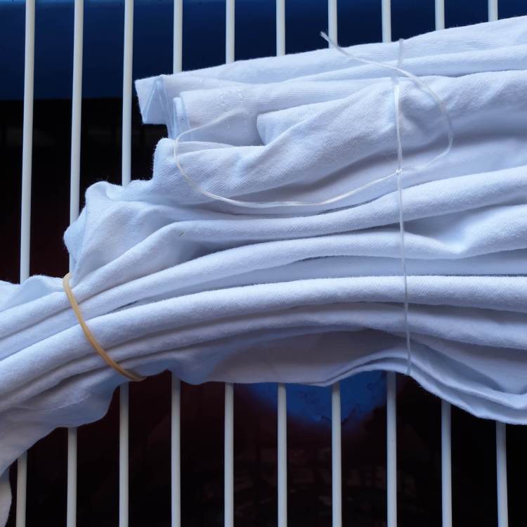 I gently gathered the tee from the top corner down and loosely tied together to keep the folds together.