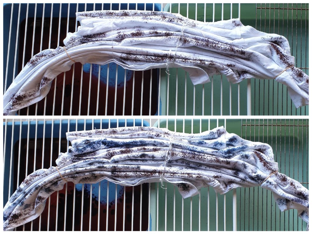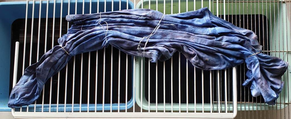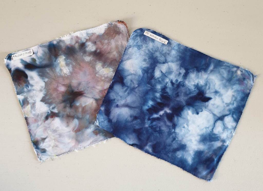 I had a look at my swatches to see what may look good for a man’s t-shirt. Some guys like something “not so out there” with colours so I picked these two shades of blue and grey – Indigo Blue from Sunny Daisy Tie Dye and and Procion Grey from Kraftkolour. As I was doing an ice dye, I could see from the swatches that the colours were going to split nicely on this tee.