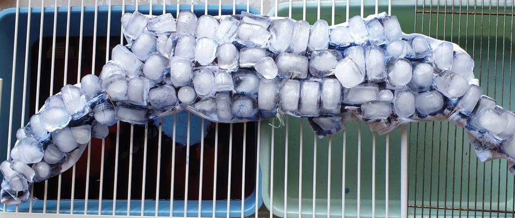 Time to place the ice on top and let the magic happen. Unfortunately I don’t have huge supplies of ice so I’m just using my stash of ice cubes of different sizes from my freezer.